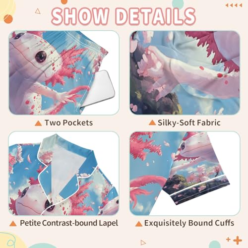 Satin Pajama Sets Short Sleeve Cute Axolotl Pink Cherry Blossoms Button Down Silky Nightwear 2 Piece PJS 5-14Y 1