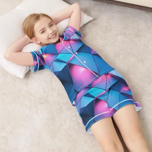 Satin Pajama Sets Short Sleeve Blue and Pink Abstract Triangles Button Down Silky Nightwear 2 Piece PJS 5-14Y 1