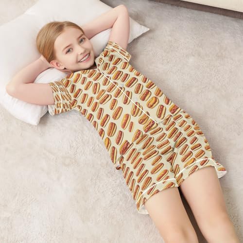 Satin Pajama Sets Short Sleeve Cartoon Hot Dog Pattern Button Down Silky Nightwear 2 Piece PJS 5-14Y 6