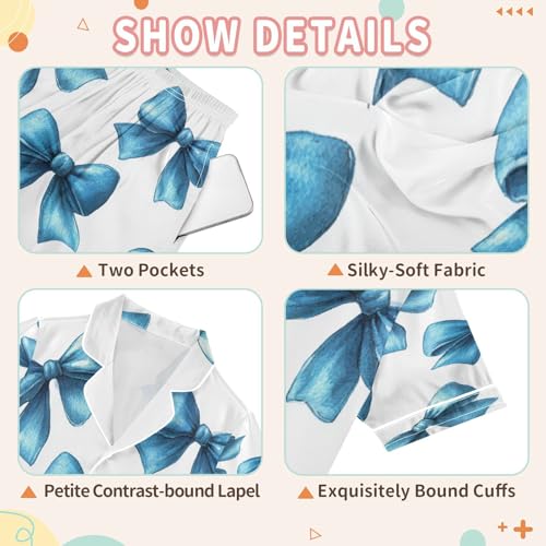 Satin Pajama Sets Short Sleeve Blue Bows on White Button Down Silky Nightwear 2 Piece PJS 5-14Y 1