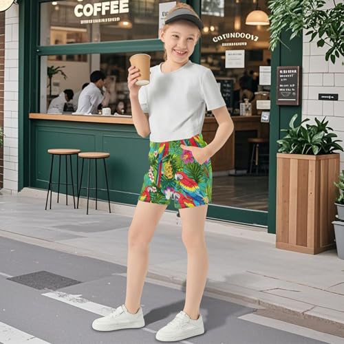 Girls Athletic Shorts Colorful Parrot Tropical Leaves Cute Summer Print Pajama Activewear for Kids Teens, X-Small 6