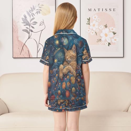 senya Cat Sleeping in Space Satin Summer Pajama Sets Silk Short Sleeve Button Down Sleepwear 5