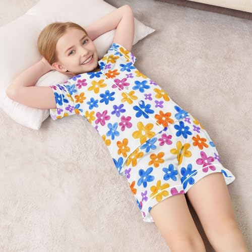 Flower Color Cute Simple Pattern Summer Satin Pajama Set, Cute Button-Down Sleepwear Pj Set for Sleep Wears 1