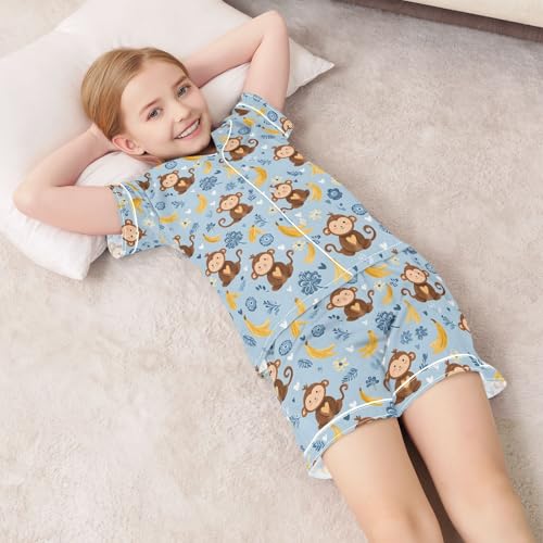 Lovely Monkey Banana Blue Prints Summer Satin Pajama Set, Cute Button-Down Sleepwear Pj Set for Sleep Wears 6