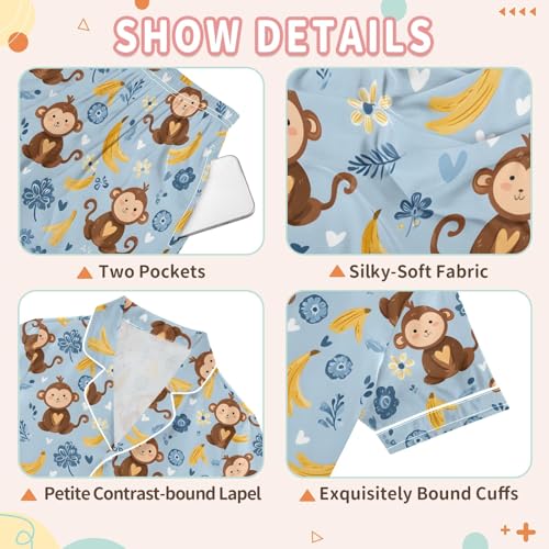 Lovely Monkey Banana Blue Prints Summer Satin Pajama Set, Cute Button-Down Sleepwear Pj Set for Sleep Wears 4