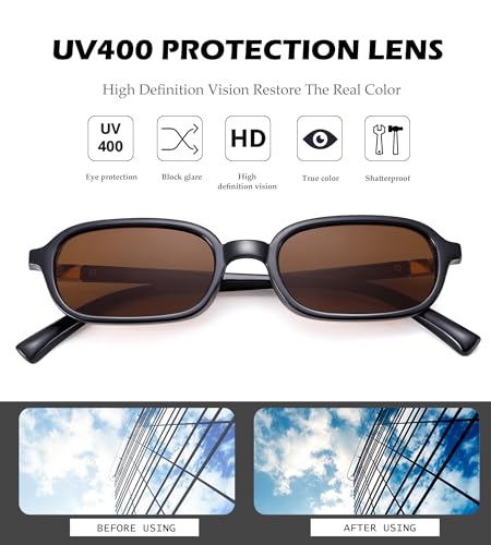 • UV400 PROTECTION LENSES - The UV400 lenses in retro 90s sunglasses minimize glare and boost contrast, enhancing visual clarity and reducing eye fatigue. To safeguard your eyes from harmful UV rays, rectangular sunglasses for women feature lenses with advanced UV protection coatings