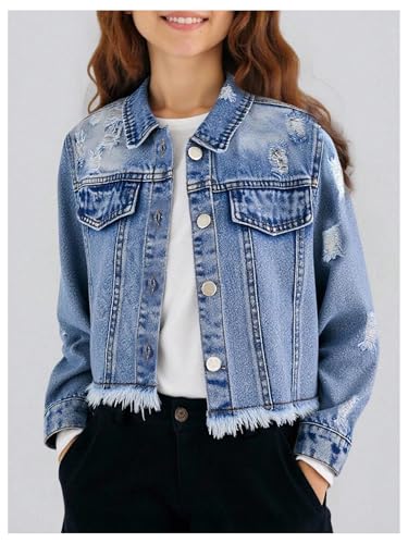 MakeMeChic Girl's Ripped Denim Jacket Long Sleeve Raw Hem Button Down Grunge Y2K Jean Coats 6