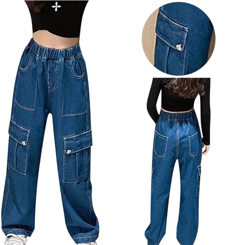 HOT ! Kids Girls Vintage Casual Loose Denim Cargo Pants Wide-Leg Jeans Elastic Waistband Trousers Daily Wear