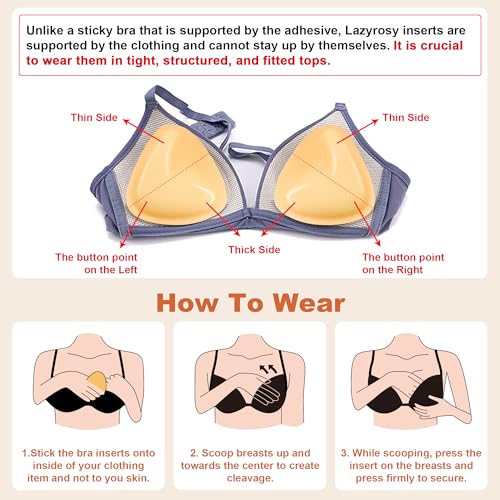 • Boosts up to 2 cup sizes instantly:Lazyrosy double sides sticky bra inserts are uniquely padded inserts that instantly lift and add up to TWO cup sizes in seconds. They give you that gorgeous cleavage in a snap! Designed with ultra-thin edges and resilient sponge, they offer two wear options, upright for a lifted look or tilted for a deep "V" cleavage.