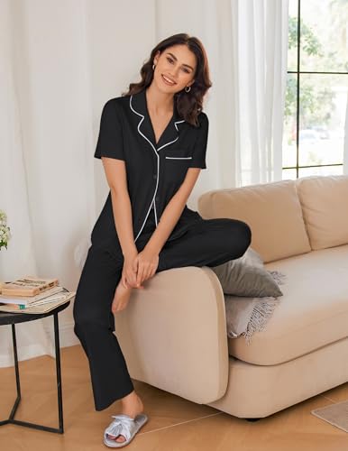 HOT ! Ekouaer 2 Pack:Womens Pajamas Short Sleeve Pjs Notch Collar Button Up Loungewear Cozy Sleepwear Sets