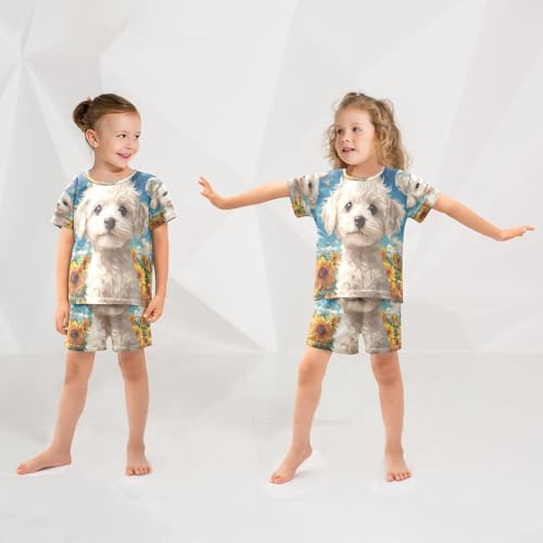 ALAZA White Dog Sunflower Blossom Pajamas Set Short Sleeve Cotton Sleepwear Summer Pjs 2 Piece 5-14Y 6
