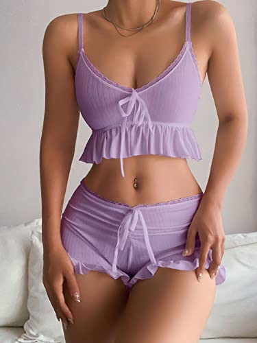 SweatyRocks Women's 2 Piece Lingerie Set Pajama Sets Ruffle Trim Tie Front Cami Top and Shorts Sleepwear 2