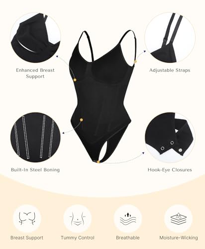• THONG STYLE: The bodysuit features a thong design that fits like a glove and hides panty lines under any outfit, giving you a flawless, streamlined look. 2-row hook-and-eyes closure helps you easily go to the bathroom. The non-compressive butt design gives you a bubble butt.