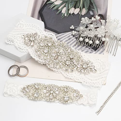 yanstar Wedding Bridal Garter Stretch Lace Bridal Garter Sets with Rhinestones Clear Crystal Pearl for Wedding 1