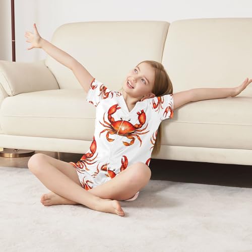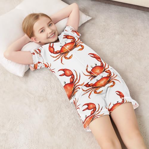 Satin Pajama Sets Short Sleeve Crab Pattern Print Design Button Down Silky Nightwear 2 Piece PJS 5-14Y 6