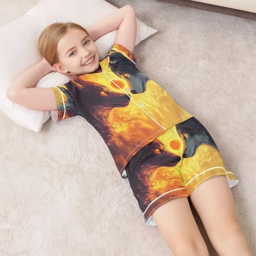 ALAZA Wolf Moon Animal Fire Satin Pajamas Set Short Sleeve Button Down Sleepwear Summer Pjs 2 Piece 1