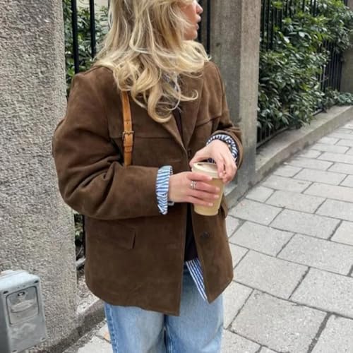 HOT ! Brown Suede Jacket Women - Y2K Faux Suede Blazer Coat Vintage Aesthetics Old Money Oversized Outerwear
