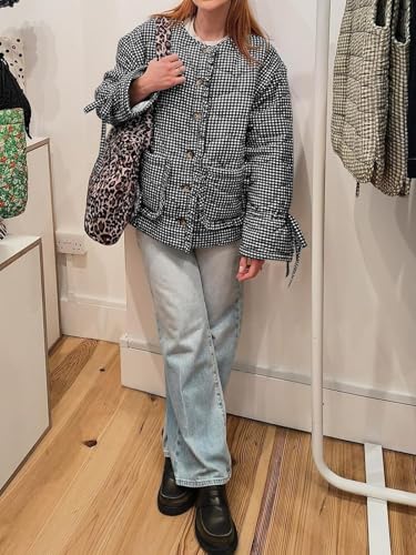 HOT ! Tankaneo Womens Cropped Quilted Puffer Jackets Lightweight Plaid Button Down Bow Padded Down Coat
