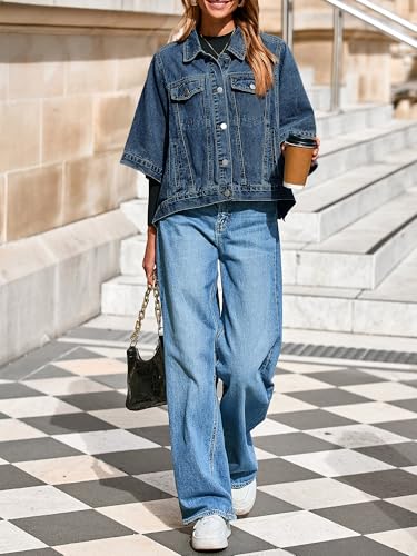 Tankaneo Womens Jean Jacket Oversized Cropped Short Sleeve Cotton Denim Jacket Fall Trendy Cape Outerwear with Pockets 1