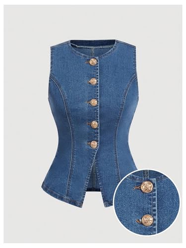 HOT ! MakeMeChic Women's Denim Vest Top Summer Button Down Sleeveless Jean Jacket Crew Neck Waistcoat