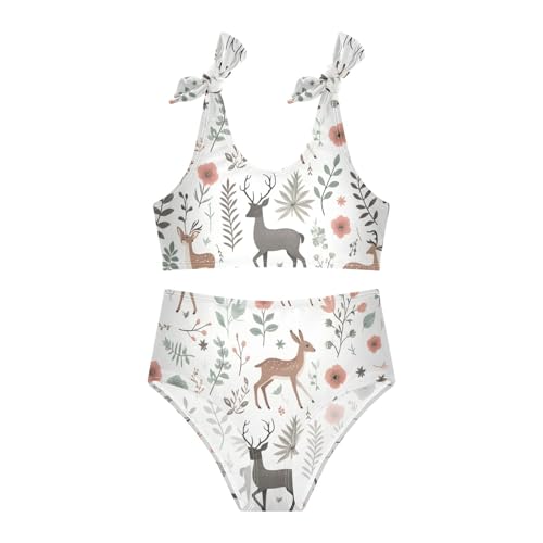 HOT ! Girls' Bikini Set, Deers Floral Elements Branches Kids Swimsuit 2 Pcs Beach Bathing Suit