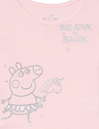 • Toddler girls T-shirt pack includes: a pink tee with a front graphic of Peppa and "Believe in Magic" in silver glitter, a blue T-shirt with a Peppa and Suzy Sheep "Smile" front graphic, and a grey T-shirt with an allover Peppa Pig print