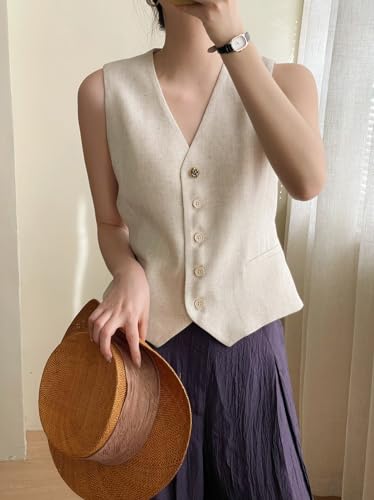 Ceehuteey Women's Linen Suit Vests V-Neck Single Breasted Elegant Waistcoat Business Outfits Top 5