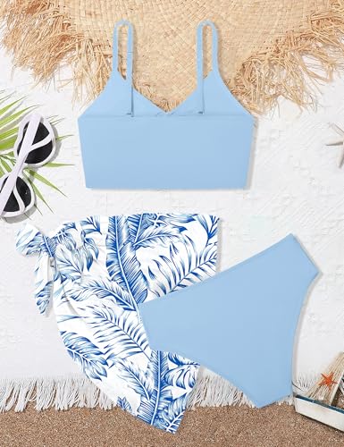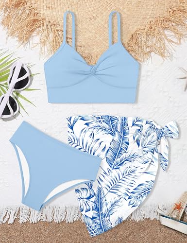 MIGU Girls Swimsuit Bathing Suit Solid Color Twist Cross Tropical Floral 3 Piece Girls' Swimwear Bikini with Cover Up 9-16T 3