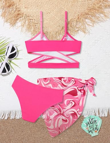 Girls Swimsuit 3 Piece Bathing Suits Criss Cross Color Block Bikini Set with Beach Cover Up Girls' Swimwear 7-16 Years 3