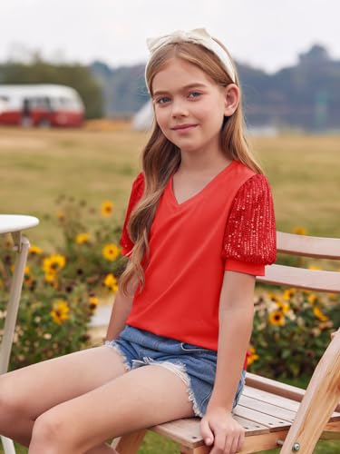 Haloumoning Girls Sequin Puff Short Sleeve Tunic Tops Kids Casual Loose V Neck Summer T Shirts Blouse 5-14 Years 5