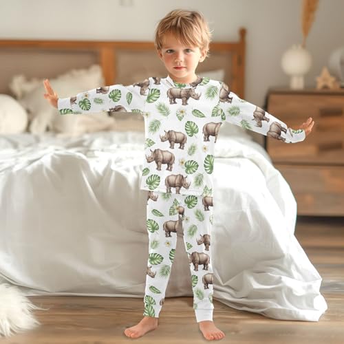 Pajama Sets Long Sleeve Rhino Leaves Flowers Pattern Soft Comfy Sleepwear 2 Piece PJS 3-8T 3
