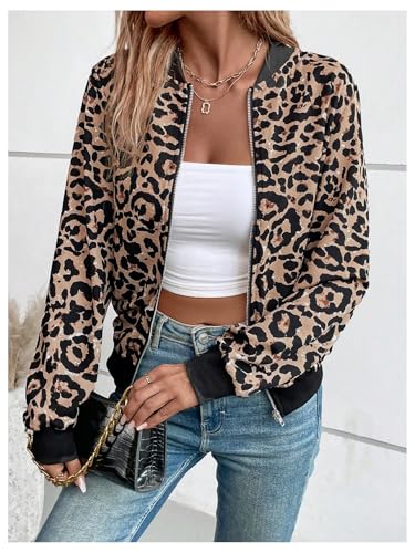 SweatyRocks Women's Leopard Print Jacket Zip Up Long Sleeve Bomber Jackets Outwear 1