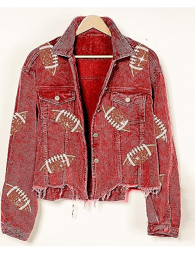 • Design:The casual cropped corduroy jackets for women,solid color,long sleeves with button cuffs,distressed raw fringe hem,football pattern printed,front button placket,two chest pockets,corduroy fabric,boyfriend style,which are suitable to decorate your figure.