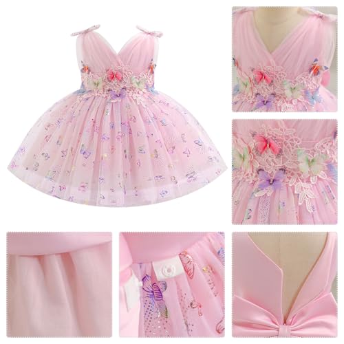 • Design: Baby girl's mesh sleeveless V-neck 3D butterfly chiffon pleated dress, making your girl look elegant and gorgeous in the crowd. A sleeveless V-neck top with a bow tie on each shoulder, lace ruffled chiffon and 3D butterfly on the front, looks so fashionable and beautiful among people. V-shaped cut with hidden zipper, exaggerated bow with snap closure, youthful yet powerful, suitable for gatherings.