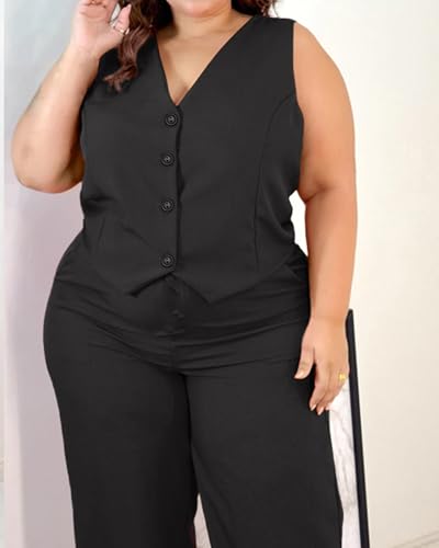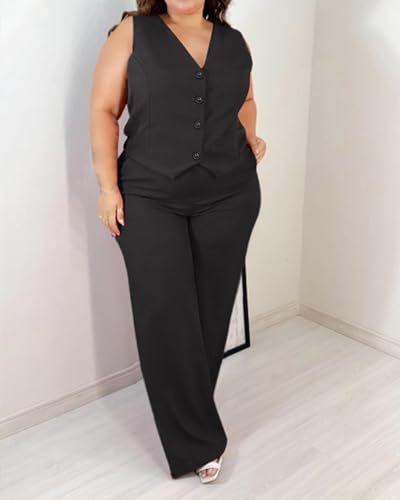 Women's Plus Size Pant Suits 2 Piece Outfits Button Vest Blazer Pockets Wide Leg Pants Sets Casual Pantsuits 2