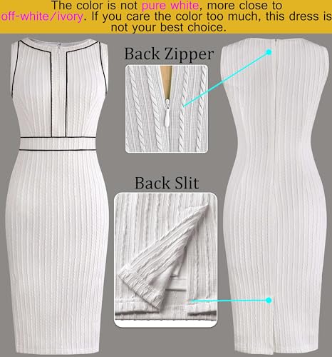 • Style: Round Neckline; Sleeveless; Patchwork Piping design; Adjustable Front Zipper allows you to be casual or modest; Bodycon Silhouette; A Concealed Back Zipper; Knee Length; A Back Slit for easy walking.