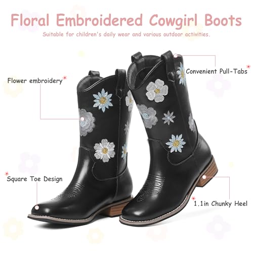 Goiphrri Cowgirl Boots For Girls Mid Calf Cowboy Boot Toddler Chunky Low Heel Western Boots with Floral Embroidered Square Toe Horse Riding Dress Shoes For Little/Big Kids 1