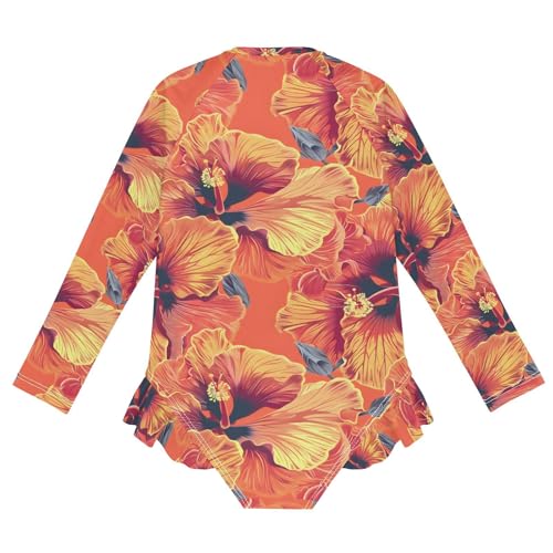 ALAZA Orange Red Hibiscus Flower Blossom Girls One Piece Swimsuit Long Sleeve Rash Guard Swimsuits UV 50+ Swimwear Zipper 1