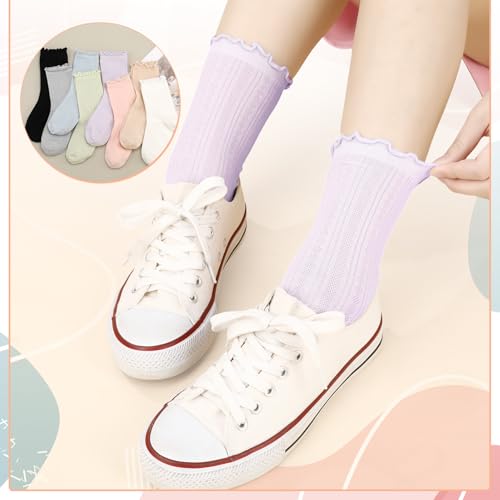 Jspupifip 8 Pairs Womens Ruffle Socks Turn-Cuff Crew Socks, Casual Cotton Dress Sock Frilly Breathable Ribbed Crew Sock 5