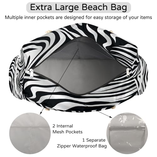 Large Beach Tote Bags for Women Zebra Animal Skin Waterproof Sandproof Shoulder Bags Swim Pool Purse with Zipper Beach Vacation Essentials for Summer Swim Pool Travel Gifts 4